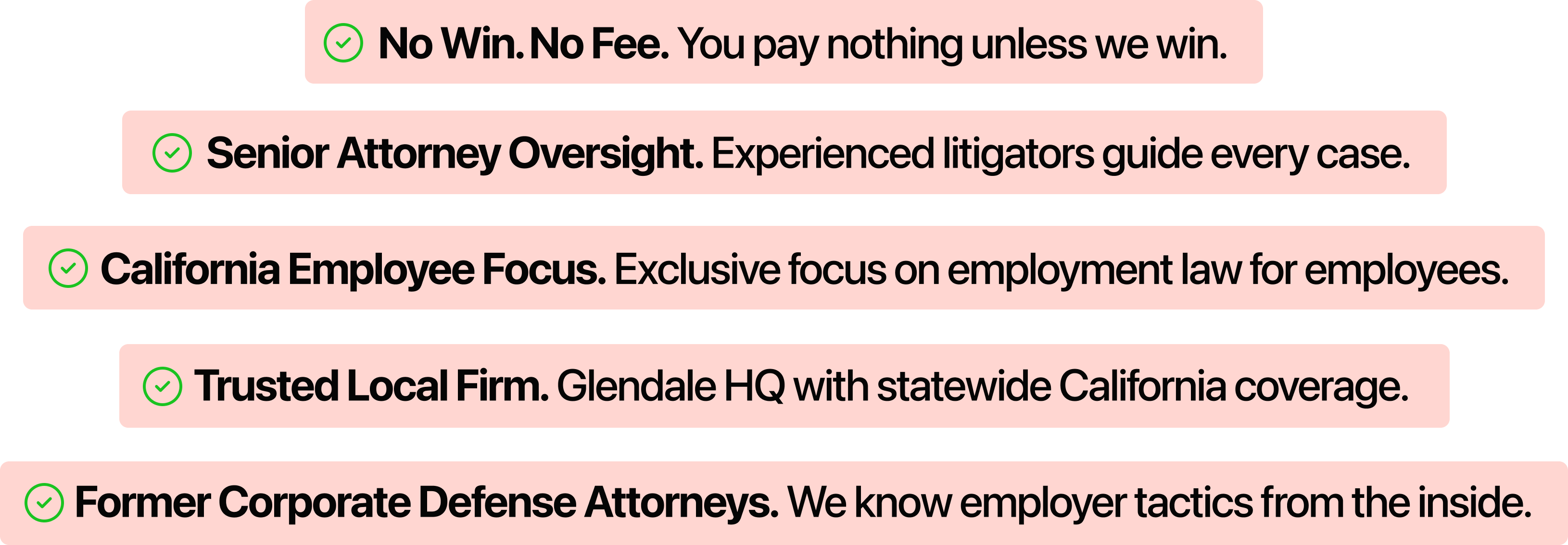 97% win-rate. 15 years of results. Millions recovered for California employees by senior attorneys who only get paid when you do.